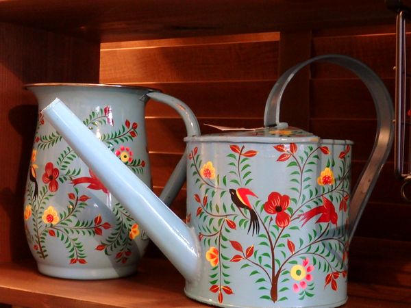 15世紀ペルシャの時代から伝承されたカシミール地方のハンドペイント。主にペーパーマッシュ(張り子細工)に施される繊細な手彩色です。今回はジャグとジョーロに。水色と赤が効いています。