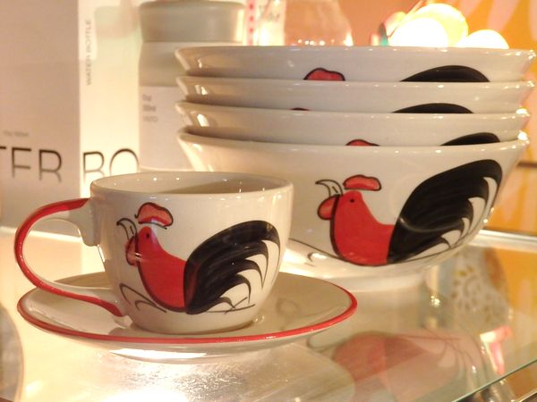ユニークな鶏の絵付けのカップ&ソーサーと大きめボウル。