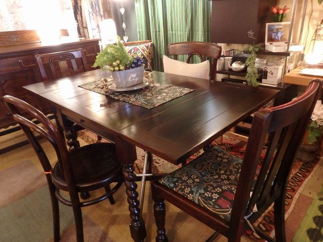 現在お店にあるDLT(ドローリーフテーブル)は75㎝角の小ぶりの天板。そこから両側に28㎝28㎝と引き出して写真の状態になります(W131cm×D75cm)時を経た木の質感と家具が纏った雰囲気がアンティーク家具の魅力です。近頃はなかなか家具を揃えるというより、合理的な収納が価値があるような風潮だけど、アンティークに限らず家具って楽しいよ!って本気で思っているのです。特にシチュエーションを変えるといろんな風に使えるアンティーク家具は懐の深い頼れる友人です。 カテゴリー: お店のこと