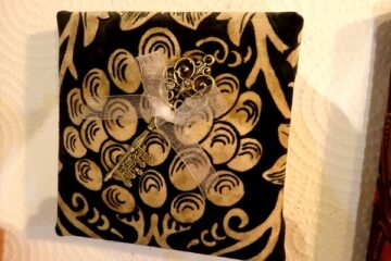15㎝角ほどの小さなファブリックパネル。膨らみをもたせてポイントに鍵とシルクリボン、ベースの生地はモリスのブラックベルベット。特別感のあるクラシックな壁掛けになりました。
